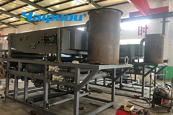 工作原理:在密閉的狀態下,經過高壓泵打入的污泥經過板框的擠壓,使污泥內的水通過濾布排出,達到脫水目的。