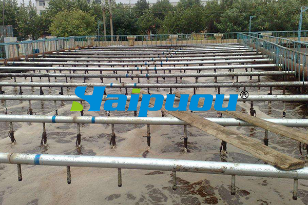 污水和回流的活性污泥一起進入曝氣池形成混合液。從空氣壓縮機站送來的壓縮空氣,通過鋪設在曝氣池底部的空氣擴散裝置,以細小氣泡的形式進入污水中,目的是增加污水中的溶解氧含量,還使混合液處于劇烈攪動的狀態,呈懸浮狀態。溶解氧、活性污泥與污水互相混合、充分接觸,使活性污泥反應得以正常進行。