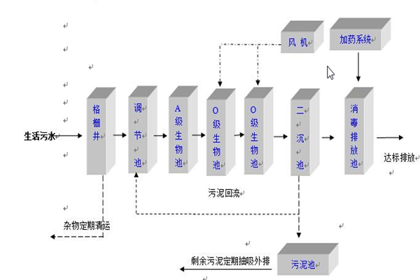 第三階段:好氧處理出水,溢流進沉淀池,沉淀后上水,進入消毒池,沉淀池內的污泥用泥漿泵定期注入污泥濃縮罐,定期脫水外運。