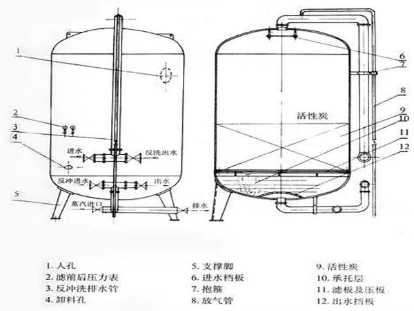 活性炭過濾器是一種罐體過濾器,外殼一般為不銹鋼或玻璃鋼,內(nèi)部填充活性炭。活性炭過濾器用于過濾水中的游離物、微生物和一些重金屬離子,可以有效降低水的色度。